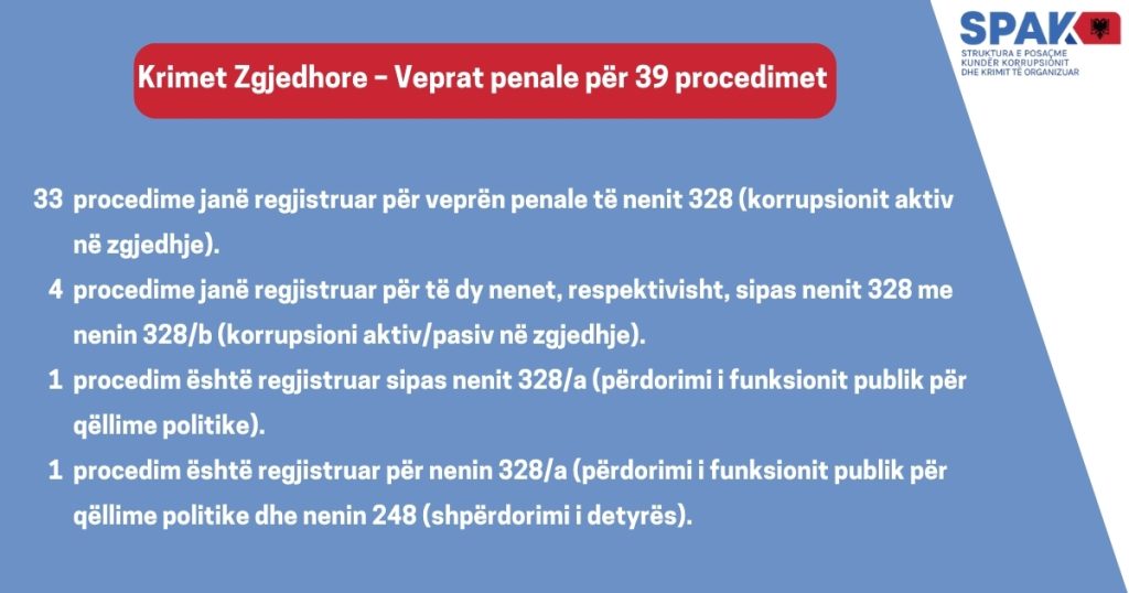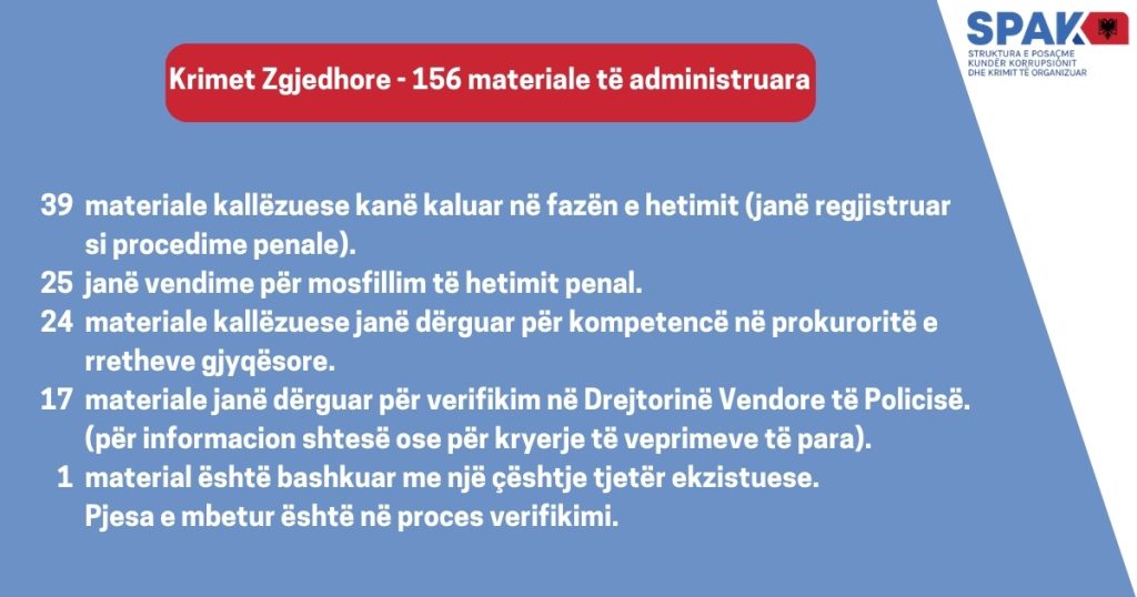 Nga këto, SPAK bën të ditur se 39 materiale kallëzuese kanë kaluar në fazën e hetimit, 25 janë vendime për mos fillim të hetimit dhe 24 raste janë dërguar për kompetencë prokurorive në rrethe.
