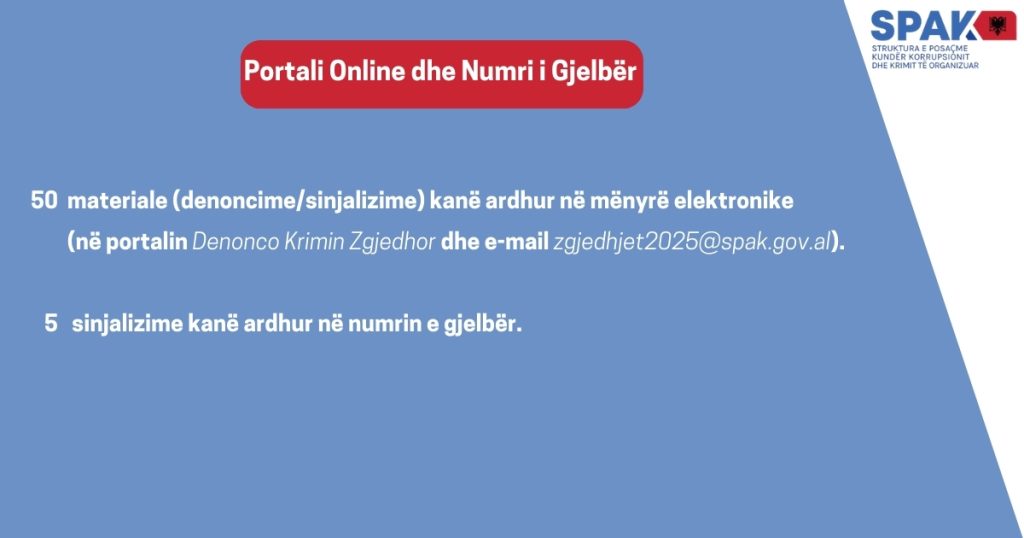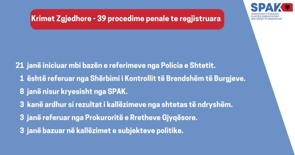 Në shifrat e bëra publike në rrjetin social FB, SPAK bën të ditur se 21 raste janë iniciuar mbi bazën e referimeve nga Policia e Shtetit, 8 janë nisur nga vetë SPAK dhe 3 janë bërë kallëzime nga shtetas të ndryshëm.